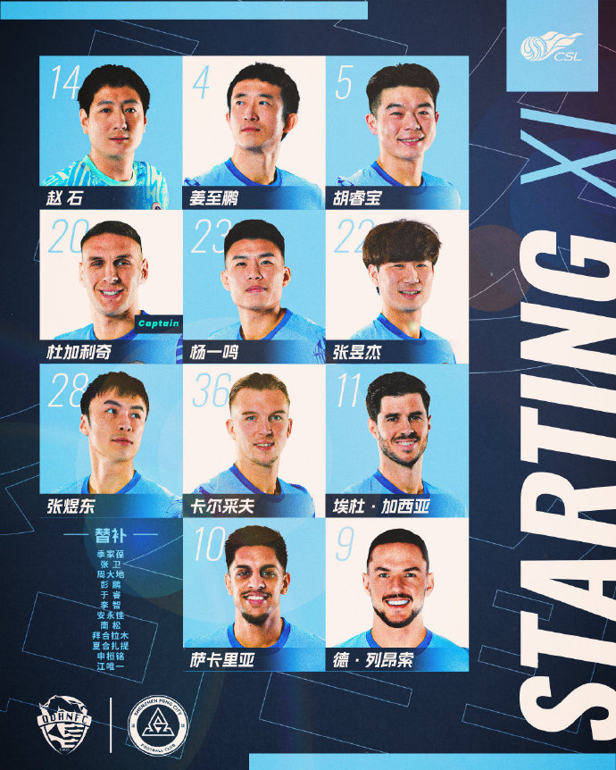 青島海牛替補:1-劉君、2-肖鯤、5-沙一博、8-林創(chuàng)益、10-馮伯元、12-陳純新、24-胡靖航、27-鄭龍、31-羅森文、33-劉佳燊、34-金永浩、37-韋所為