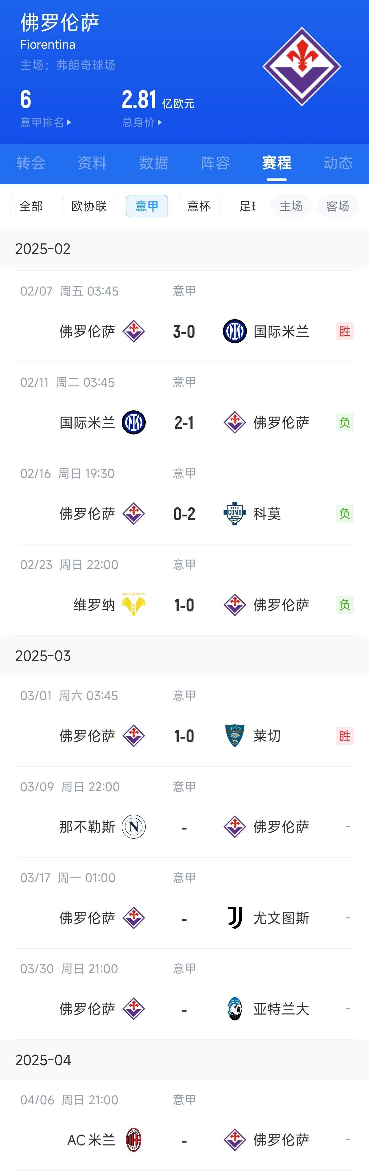 此前佛羅倫薩曾在補(bǔ)賽3-0擊敗目前的意甲頭名國(guó)米,接下來的比賽,佛羅倫薩與2/3/4名的對(duì)陣結(jié)果極為關(guān)鍵,堪稱冠軍判官。