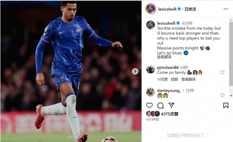 科爾維爾社媒曬出自己的比賽照片,配文:“我今天犯了一個(gè)可怕的錯(cuò)誤,但我會(huì)更強(qiáng)地反彈,這就是為什么你需要頂級球員來拯救你。今晚獲得了重要的積分,加油,藍(lán)軍!”