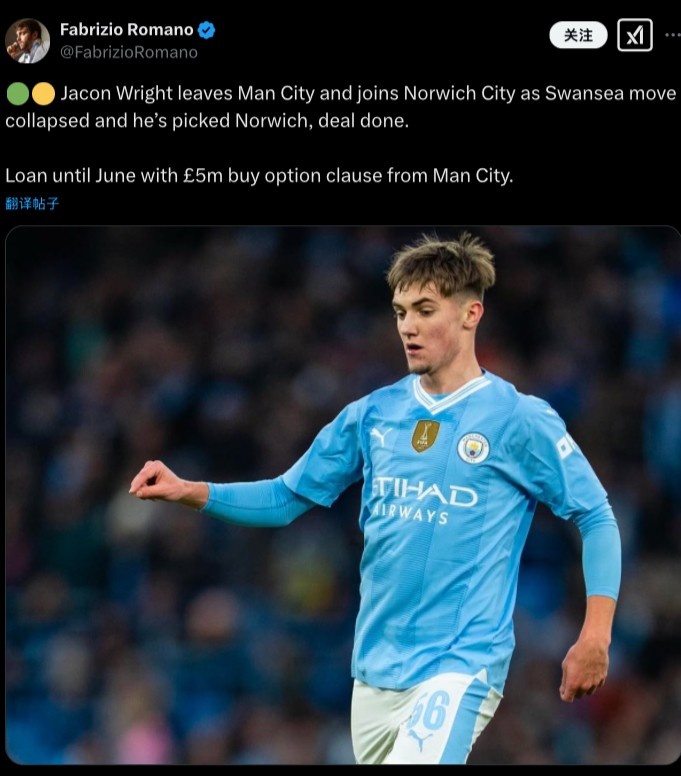 羅馬諾在社媒寫道:“盡管加盟斯旺西的談判破裂,不過雅各布-賴特依舊將離開曼城,球員選擇租借加盟到諾維奇效力。租期到今年6月止,合約中附帶500萬鎊選擇買斷條款?!?/p>