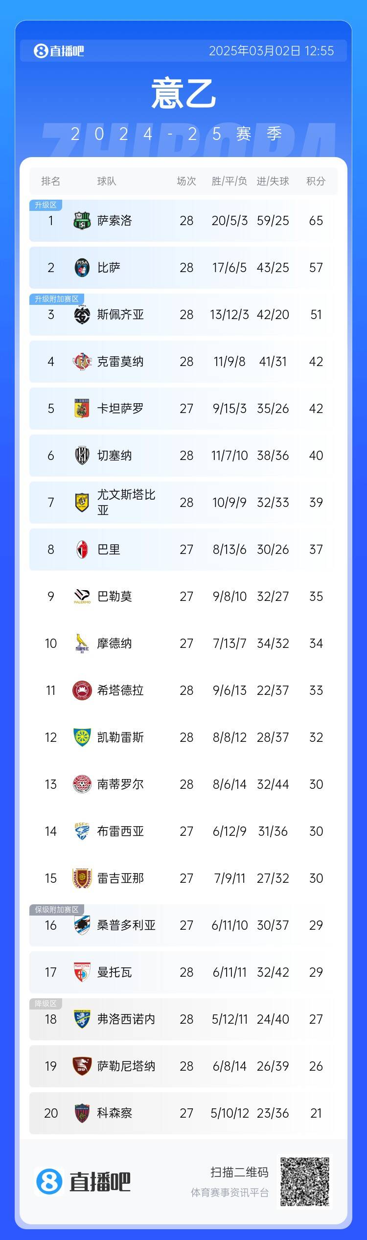03月02日訊 意乙今天凌晨第28輪天王山之戰(zhàn),薩索洛1-0擊敗比薩,8分領(lǐng)跑意乙。