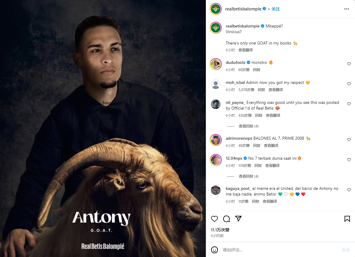 賽后,貝蒂斯官方曬出安東尼與山羊(GOAT)的P圖,配文:“姆巴佩?維尼修斯?我的字典里只有一位GOAT????”