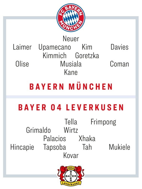諾伊爾/萊默爾、于帕梅卡諾、金玟哉、戴維斯/基米希、格雷茨卡/奧利塞、穆西亞拉、科曼/凱恩