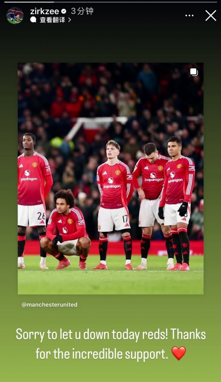 3月3日訊 足總杯1/8決賽,曼聯(lián)點(diǎn)球大戰(zhàn)不敵富勒姆,齊爾克澤最后一個(gè)為曼聯(lián)主罰點(diǎn)球,但遺憾罰丟。賽后,他更新社媒致歉。