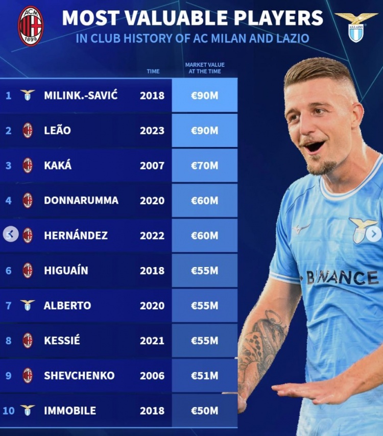 3月3日訊 米蘭將在本輪意甲焦點戰(zhàn)主場迎戰(zhàn)拉齊奧,《轉會市場》也列出了兩隊歷史德轉身價最貴榜單。
