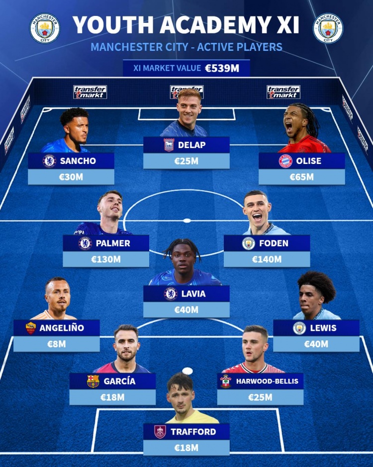 曼城青訓(xùn)出品球員最佳陣↓(括號(hào)內(nèi)為球員目前效力球隊(duì))