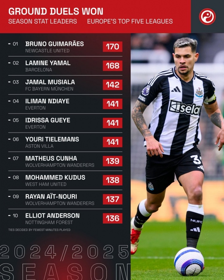 3月3日訊 數(shù)據(jù)機(jī)構(gòu)squawka統(tǒng)計(jì)了本賽季五大聯(lián)賽球員一對(duì)一獲勝情況,吉馬良斯壓亞馬爾居首。