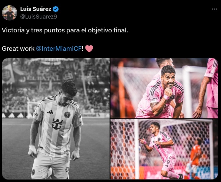 蘇亞雷斯也在賽后通過(guò)社媒曬出自己的慶祝照,并配文:“勝利與通向最終目標(biāo)的關(guān)鍵3分。全隊(duì)的表現(xiàn)很棒@邁阿密國(guó)際俱樂(lè)部。”
