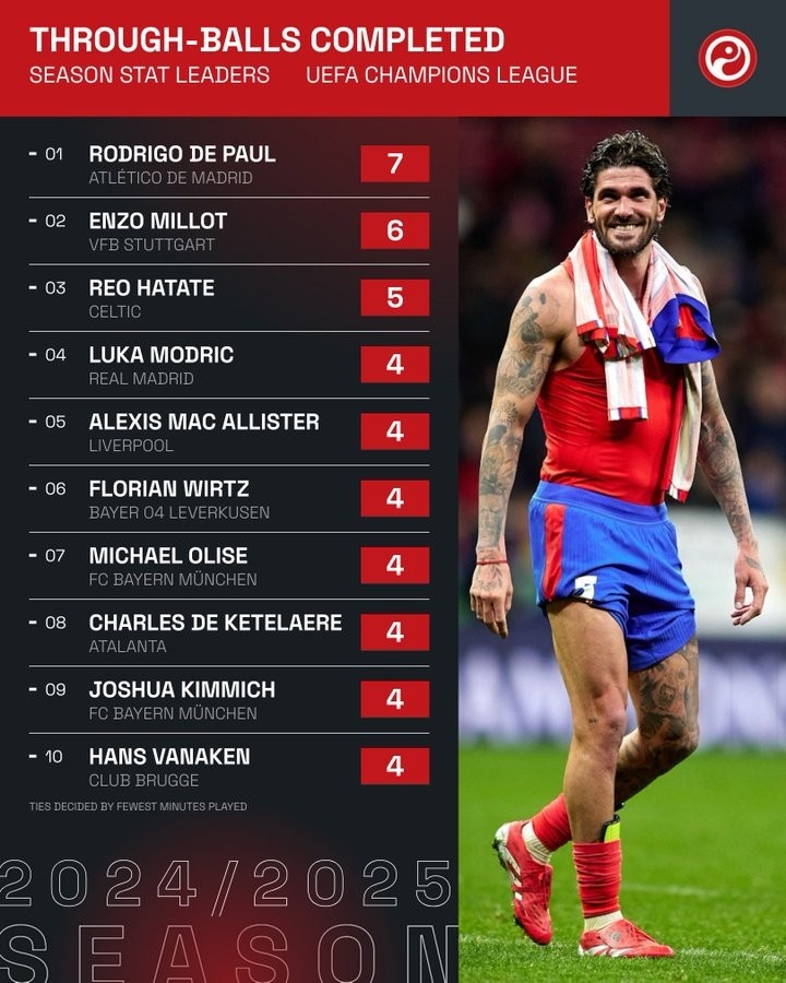 3月4日訊 歐冠十六強(qiáng)戰(zhàn)即將戰(zhàn)火重燃,數(shù)據(jù)機(jī)構(gòu)squawka統(tǒng)計(jì)了本賽季歐冠精準(zhǔn)直塞情況,德保羅居首。