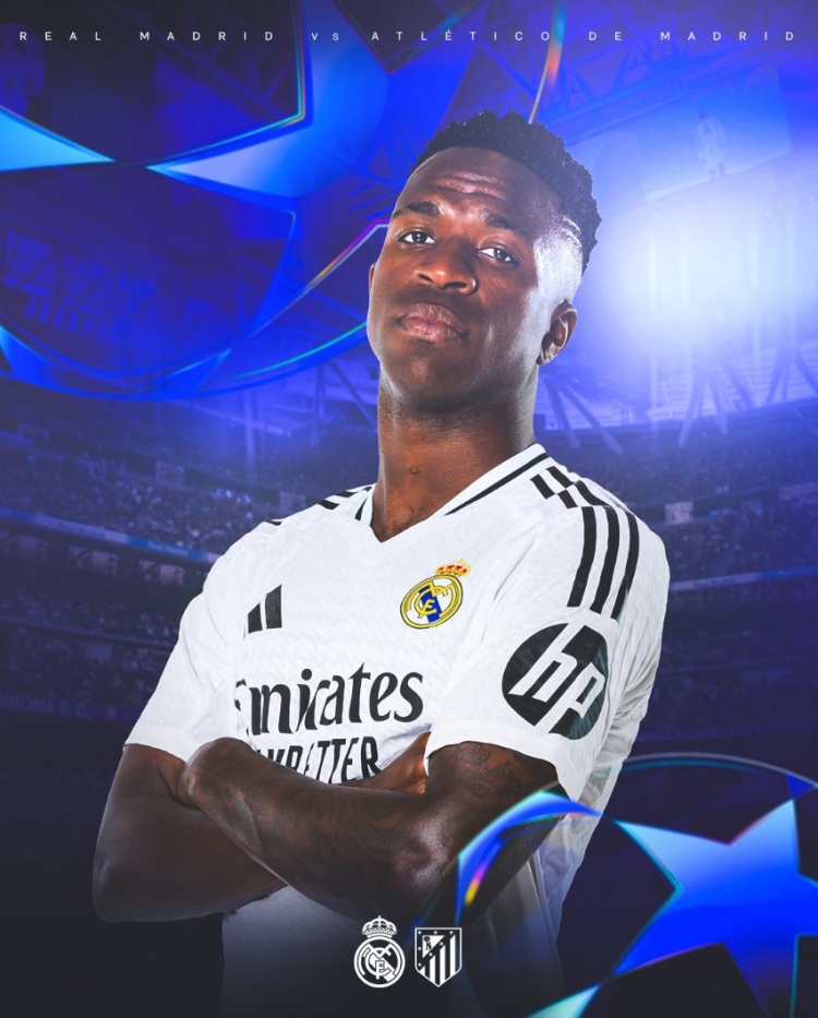 賽前,皇馬官方曬出海報,為本場比賽預(yù)熱,維尼修斯單人出鏡,海報下方為對陣雙方隊徽,還有右下角的歐冠標志。