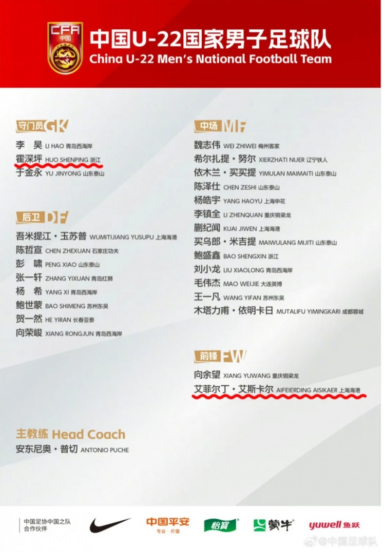 3月3日,中國足協(xié)公布U22國足2025年第一期集訓名單,恒大足校培養(yǎng)球員霍深坪、艾菲爾丁入選。為備戰(zhàn)2026年U23亞洲杯及名古屋亞運會,隊伍定于2025年3月5日至26日赴江蘇省蘇州市、鹽城市組織集訓并參加國際足球邀請賽。