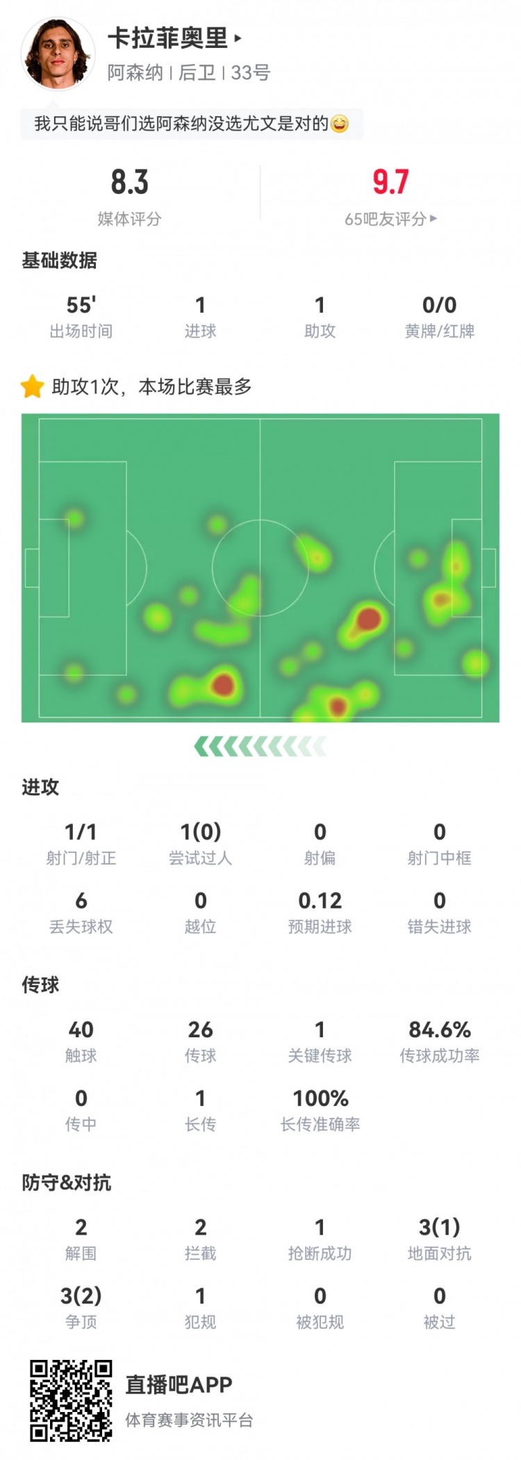 3月5日訊 歐冠1/8決賽首回合,阿森納7-1客勝埃因霍溫。此役卡拉菲奧里替補(bǔ)登場(chǎng)55分鐘,球員全場(chǎng)重點(diǎn)數(shù)據(jù)如下↓