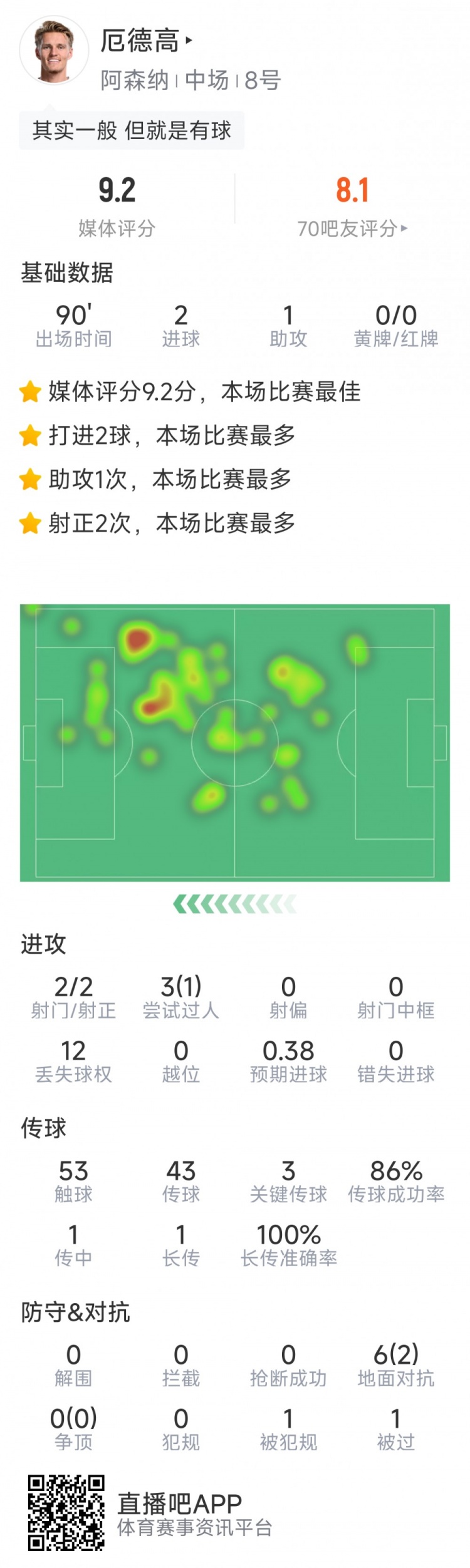 3月5日訊 在本輪歐冠阿森納7-1擊敗埃因霍溫的比賽中,厄德高表現(xiàn)出色,以下為他在本場數(shù)據(jù):