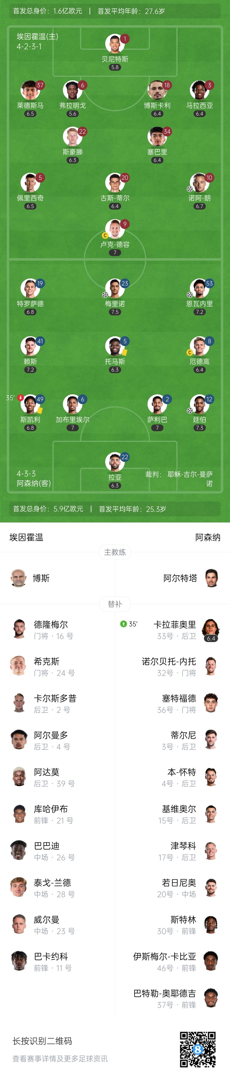 3月5日訊 北京時(shí)間4:00,歐冠1/8決賽首回合阿森納客場(chǎng)挑戰(zhàn)埃因霍溫,比賽在飛利浦大球場(chǎng)打響!上半場(chǎng),廷伯頭球破門(mén)首開(kāi)記錄,恩瓦內(nèi)里抽射建功;斯凱利染黃;隨后梅里諾再下一城!托馬斯送點(diǎn),諾阿-朗點(diǎn)射扳回一球。半場(chǎng)結(jié)束,阿森納暫時(shí)3-1領(lǐng)先埃因霍溫。