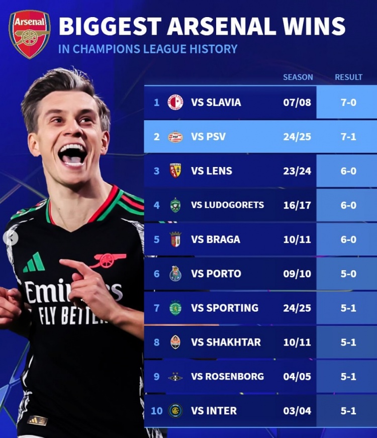 3月5日訊 歐冠16強戰(zhàn)首回合比賽已經(jīng)先賽4場,阿森納作客7-1痛擊埃因霍溫。《轉(zhuǎn)會市場》也列出了阿森納隊史歐冠單場最大比分勝利情況。
