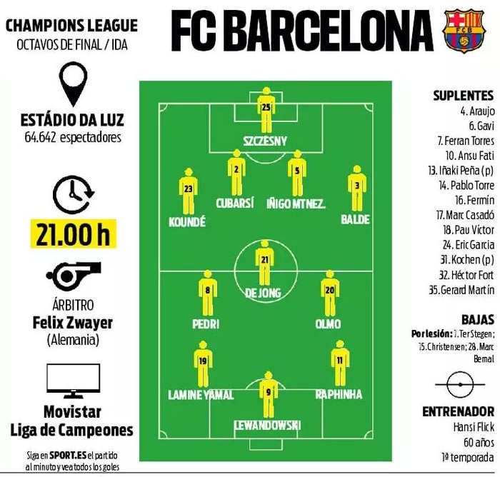 3月5日訊 巴薩將在今晚的歐冠1/8決賽首回合客場(chǎng)對(duì)陣本菲卡,《每日體育報(bào)》則對(duì)巴薩首發(fā)進(jìn)行了預(yù)測(cè),其中中場(chǎng)三人組將是奧爾莫、德容和佩德里。