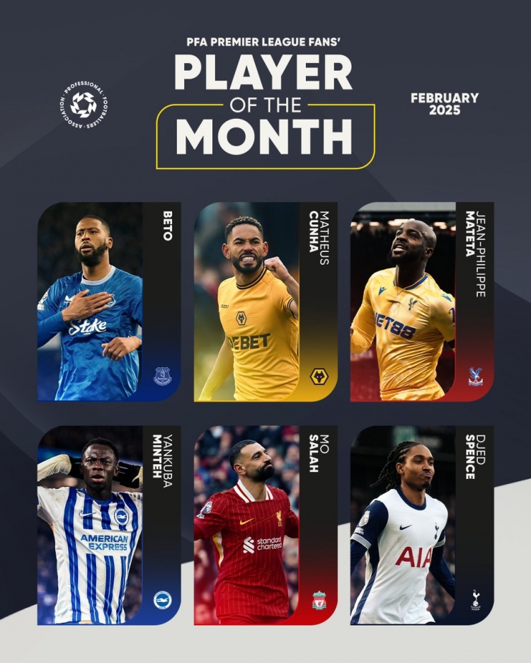 3月5日訊 PFA(英格蘭職業(yè)球員工會)公布英超2月最佳球員候選名單,獲提名的球員為貝托、庫尼亞、馬特塔、明特、薩拉赫、斯賓塞。