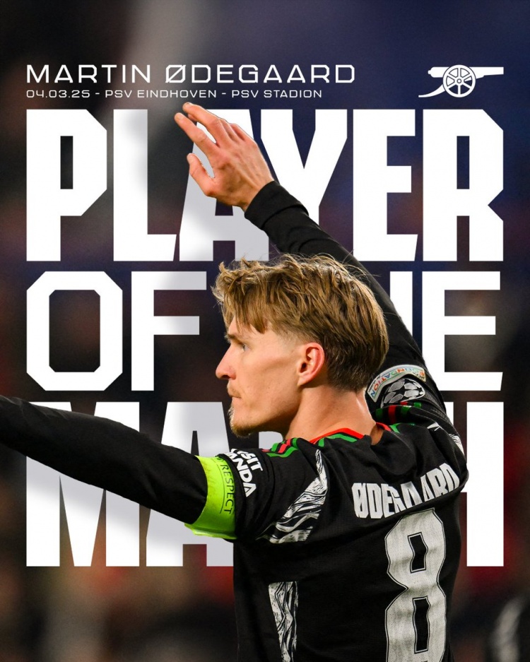 3月5日訊 北京時間今天凌晨進行的歐冠1/8決賽首回合,槍手客場7-1擊敗埃因霍溫,厄德高此役貢獻2射1傳。賽后,他獲得了球迷最多的投票,當選此役隊內(nèi)最佳球員。