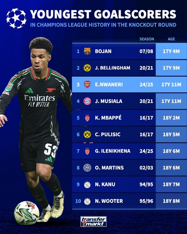 3月5日訊 阿森納在本輪歐冠淘汰賽客場7-1血洗埃因霍溫,小將恩瓦內(nèi)里破門,數(shù)據(jù)統(tǒng)計顯示他也是歷史第3年輕達成歐冠淘汰賽進球的球員。