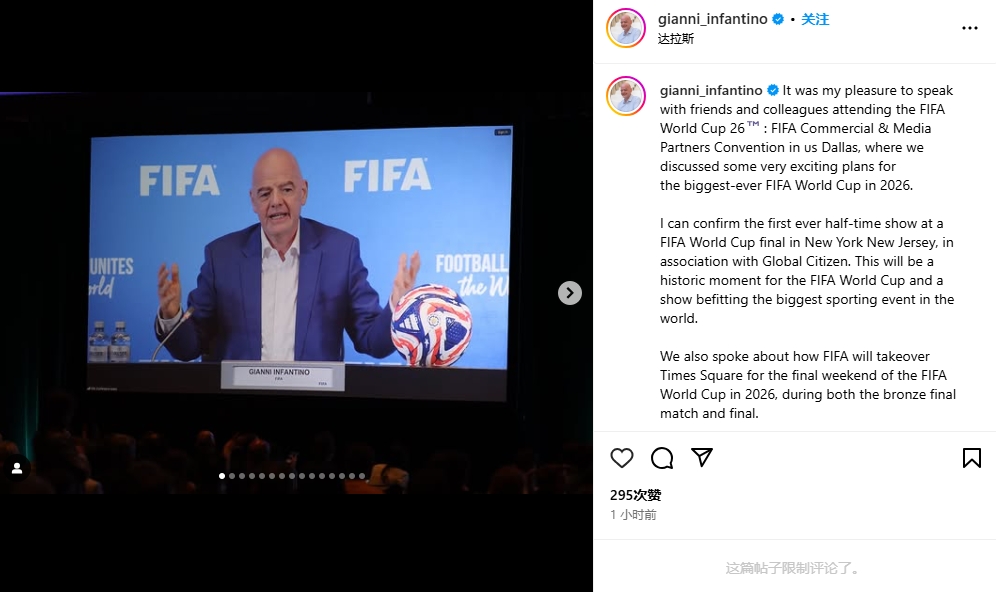 在去年公布2025年世俱杯舉辦球場(chǎng)時(shí),因凡蒂諾就透露了這一消息,此次會(huì)議因凡蒂諾再次確認(rèn)了推出半場(chǎng)表演。2026年世界杯決賽將在紐約新澤西體育場(chǎng)舉行。