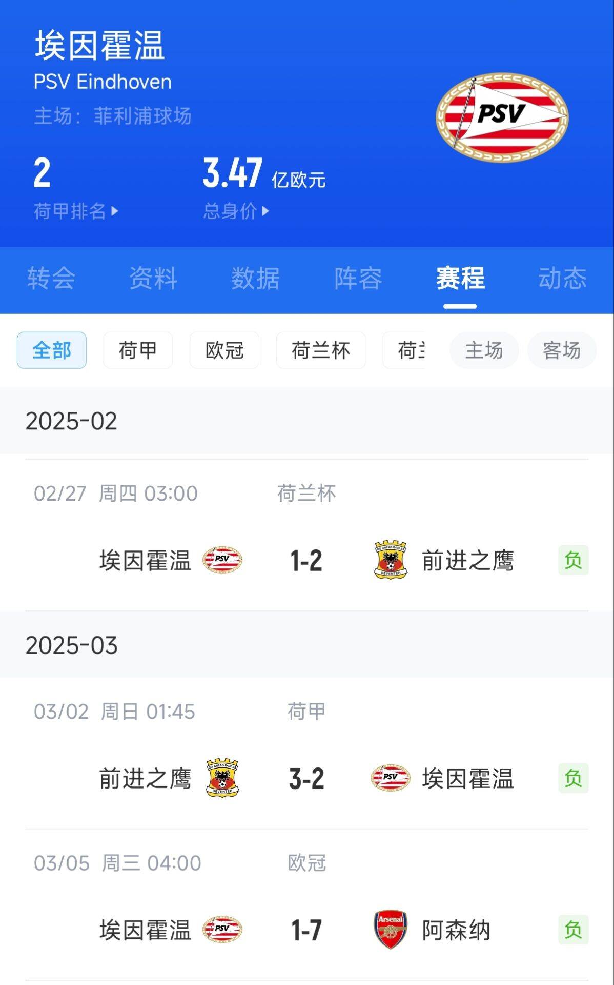 6天前的2月27日,埃因霍溫荷蘭杯半決賽1-2不敵前進(jìn)之鷹,無緣決賽。3天前的荷甲聯(lián)賽,埃因霍溫2-3被前進(jìn)之鷹雙殺,荷甲再丟3分,距離榜首阿賈克斯已有8分差距。今天凌晨,埃因霍溫歐冠遭遇慘敗,出局幾乎板上釘釘。