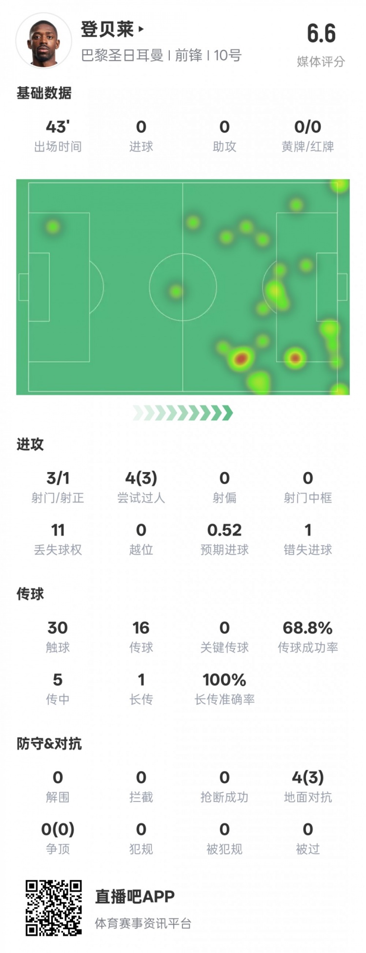 3月6日訊 歐冠1/8決賽次回合,巴黎半場暫0-0利物浦。登貝萊首發(fā)出戰(zhàn),4次過人3次成功,錯失1次進球機會,半場評分6.6。