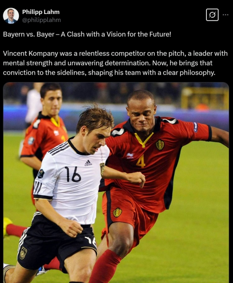 拉姆寫(xiě)道:拜仁對(duì)陣?yán)瘴謳?kù)森,這是一場(chǎng)未來(lái)愿景之間的較量!在球場(chǎng)上,孔帕尼是一位不屈不撓的斗士,一位擁有強(qiáng)大精神力量和堅(jiān)定決心的領(lǐng)袖?,F(xiàn)在,他將這種信念帶到了教練席,正在用清晰的理念塑造他的球隊(duì)。