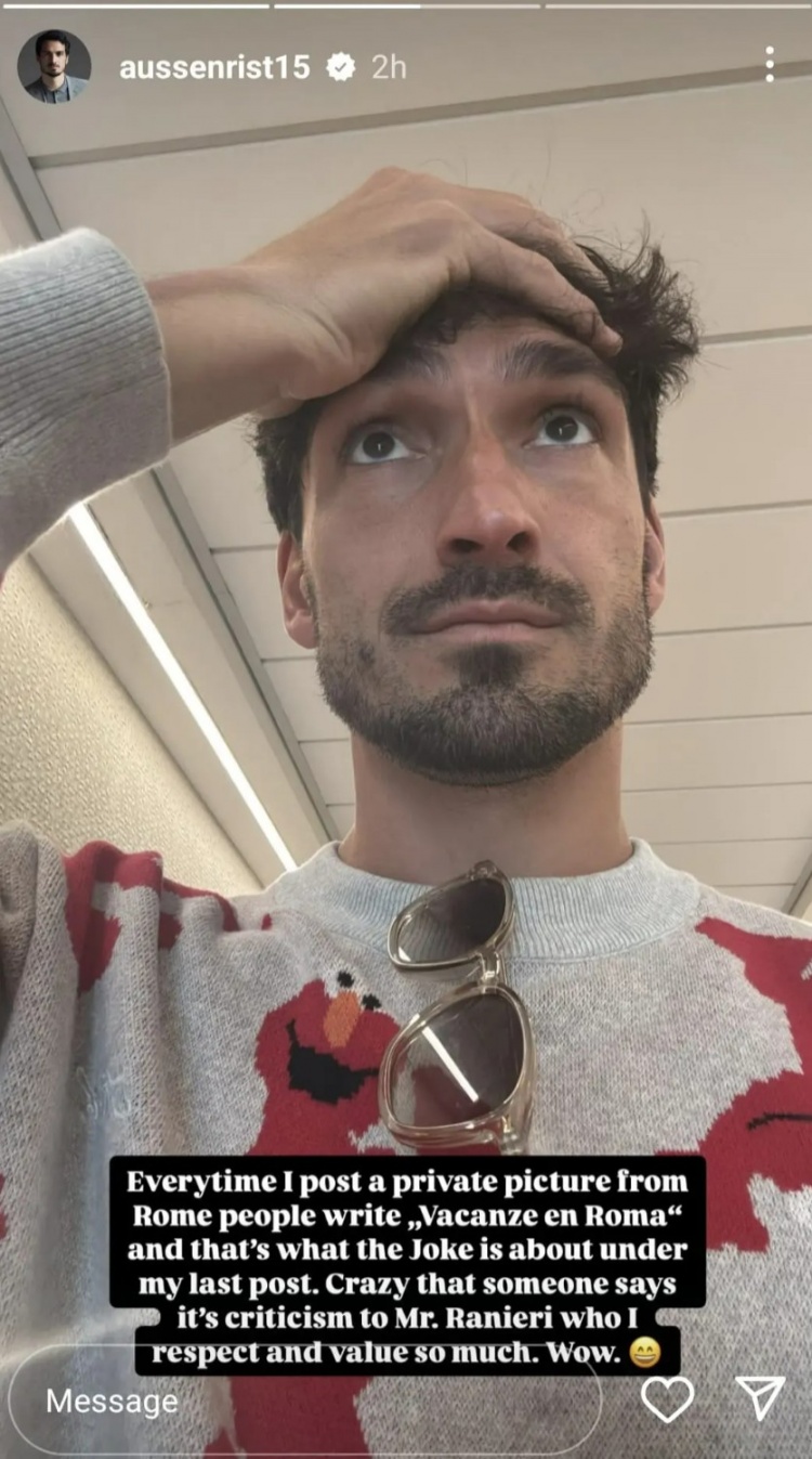 隨后,胡梅爾斯更新社媒進(jìn)行澄清。他曬出自己表情無奈的自拍,并寫道:每當(dāng)我發(fā)布在羅馬的私人照片時,人們都會寫‘羅馬假日’,這就是我上一篇帖子下面鬧出的笑話。 有人說那是對拉涅利先生的批評,這太瘋狂了,我非常敬重他。哇。????