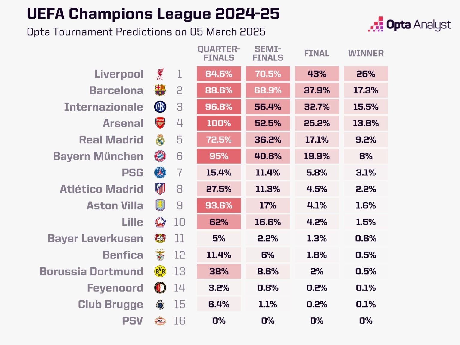 此外,Opta還計(jì)算了各支球隊(duì)晉級歐冠四強(qiáng)、決賽以及歐冠奪冠的概率。