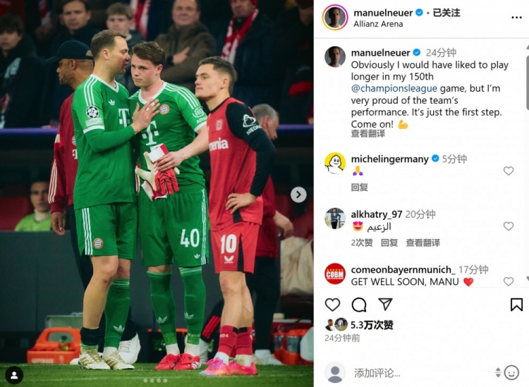 本場比賽是諾伊爾生涯第150次歐冠出場,不過他在比賽中因傷被換下。賽后他在個(gè)人社媒曬出被烏爾比希換下照片,配文道:“顯然我希望在自己第150場歐冠踢更長時(shí)間,但是我為球隊(duì)的表現(xiàn)感到驕傲,這只是晉級的第一步,加油!”
