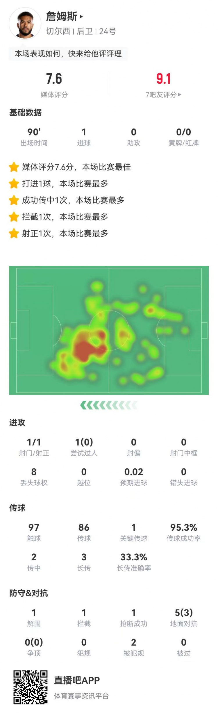 3月7日訊 切爾西在本輪歐協(xié)聯(lián)2-1擊敗哥本哈根,里斯-詹姆斯客串后腰數據如下: