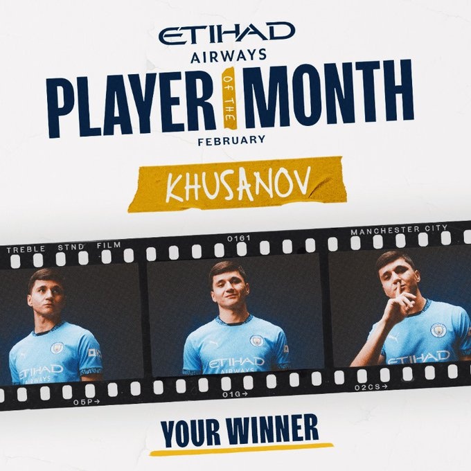 3月7日訊 曼城官方消息,俱樂(lè)部冬窗新援胡桑諾夫當(dāng)選球隊(duì)2月最佳球員。