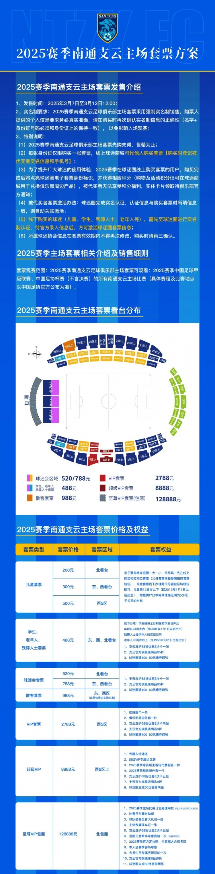 ?即日起,2025賽季南通支云足球俱樂(lè)部主場(chǎng)套票正式發(fā)售,具體方案如下: