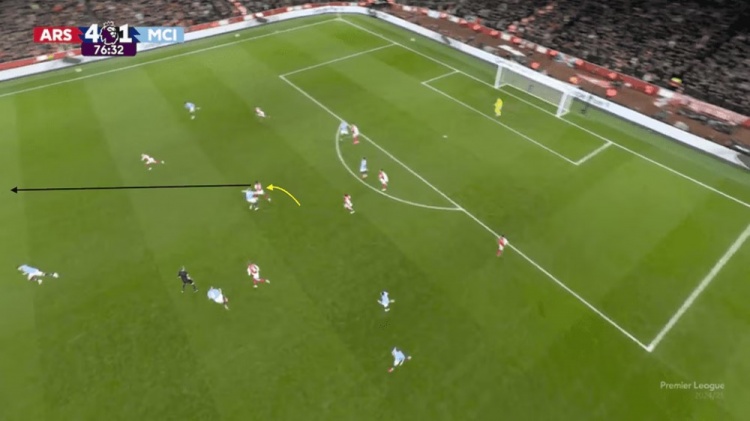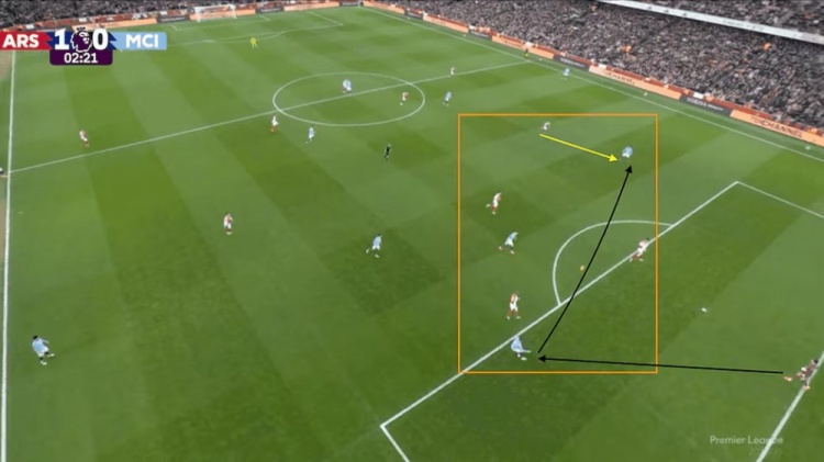 首先,球隊嚴格執(zhí)行了阿爾特塔前場高壓的戰(zhàn)術(shù),開場2分鐘的進球就是源于前場的局部4打3,從結(jié)果來看球隊的戰(zhàn)術(shù)效果非常出色。哈弗茨隨后錯失單刀的機會也是球隊力拼下來的,可惜沒能形成進球。托馬斯下半場的進球同樣源自高位攔截,他的破門是從福登的傳球攔下的。