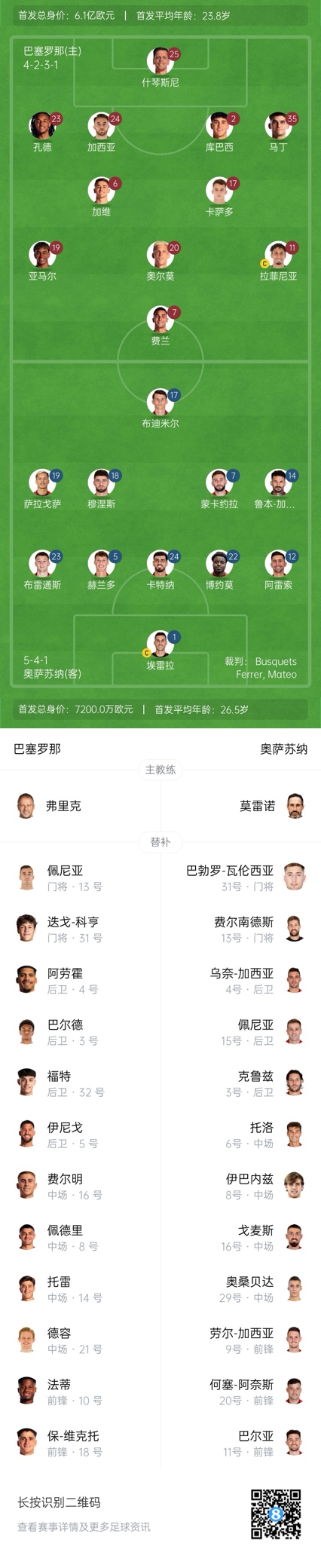 巴薩首發(fā):25-什琴斯尼、24-埃里克-加西亞、2-庫巴西、35-杰拉德-馬丁、23-孔德、6-加維、17-卡薩多、11-拉菲尼亞、19-亞馬爾、20-奧爾莫、7-費蘭