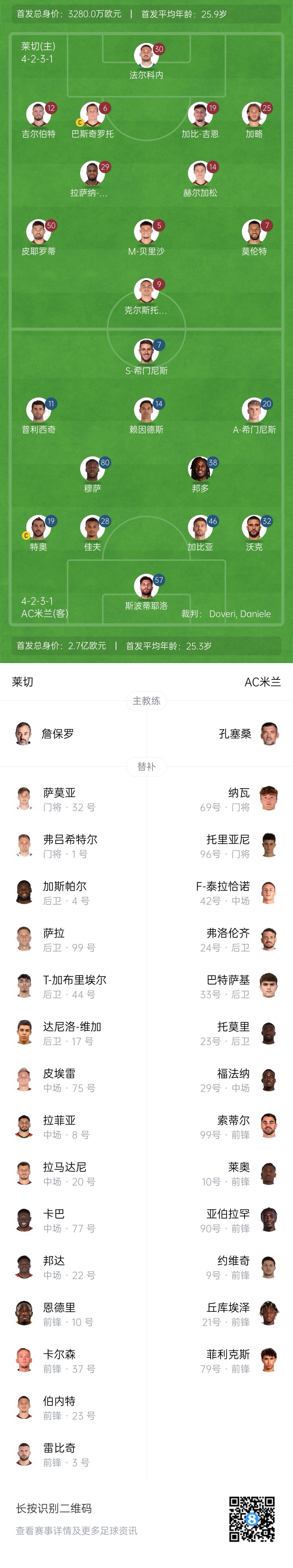 米蘭替補(bǔ):69-拉波-納瓦、96-托里亞尼、42-泰拉恰諾、24-弗洛倫奇、33-巴特薩基、23-托莫里、29-福法納、99-索蒂爾、10-萊奧、90-亞伯拉罕、9-約維奇、21-丘庫埃澤、79-菲利克斯
