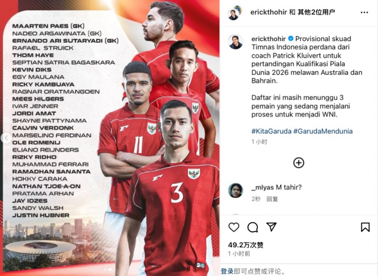 3月9日訊 今日,印尼足協(xié)主席托希爾更新社媒,曬出了印尼國(guó)家隊(duì)3月份18強(qiáng)賽大名單,迪克斯、伊澤斯、哈耶、帕斯、小賴因德斯、費(fèi)爾東克等歸化球員悉數(shù)入選。