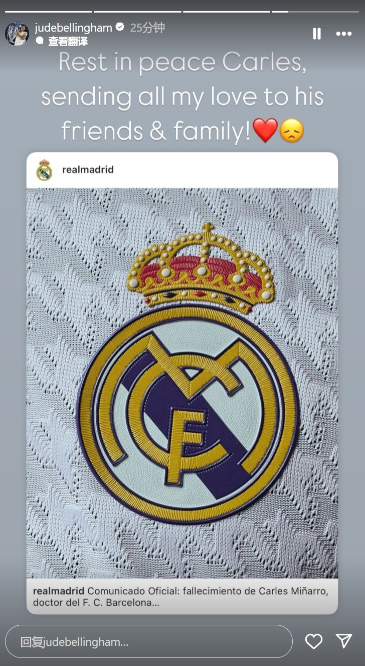 皇馬中場貝林厄姆更新社媒悼念卡萊斯,配文:“R.I.P.卡萊斯,向他的家人朋友致以我所有的愛?!?/p>