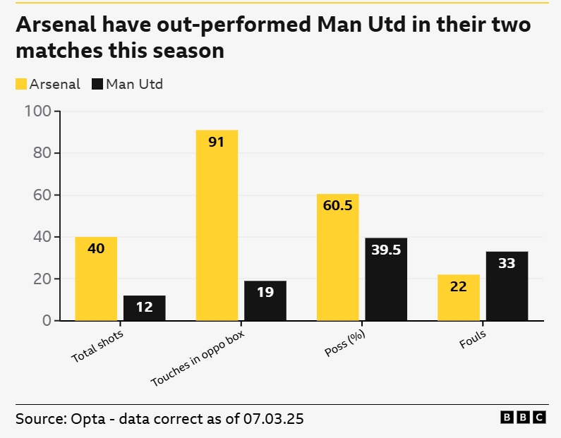 曼聯(lián)vs阿森納今夜再度上演,BBC賽前列出本賽季兩隊此前交手時的關鍵數(shù)據(jù),槍手占據(jù)壓倒性優(yōu)勢。