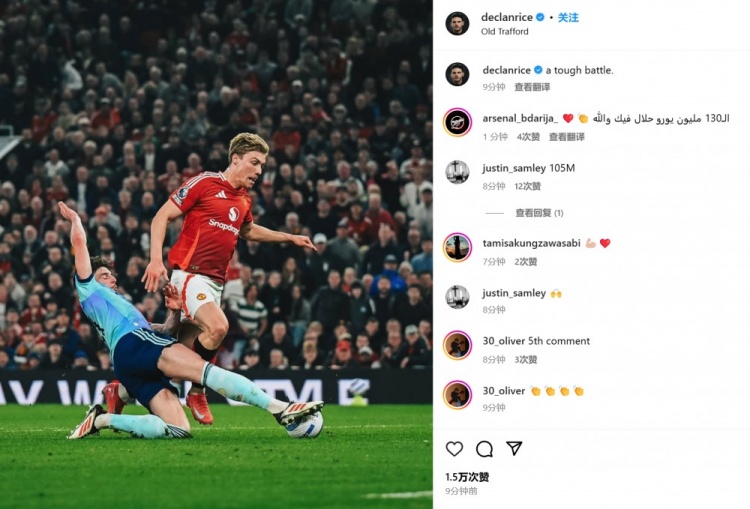 賴斯也通過社媒曬出自己倒地放鏟破壞霍伊倫單刀球的瞬間照,并配文:“一場艱難的戰(zhàn)斗?!?/p>
