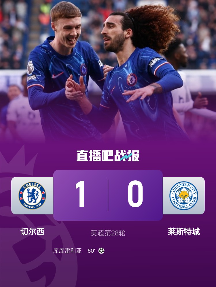 切爾西1-0擊敗萊斯特城,庫庫雷利亞打入全場(chǎng)唯一進(jìn)球。