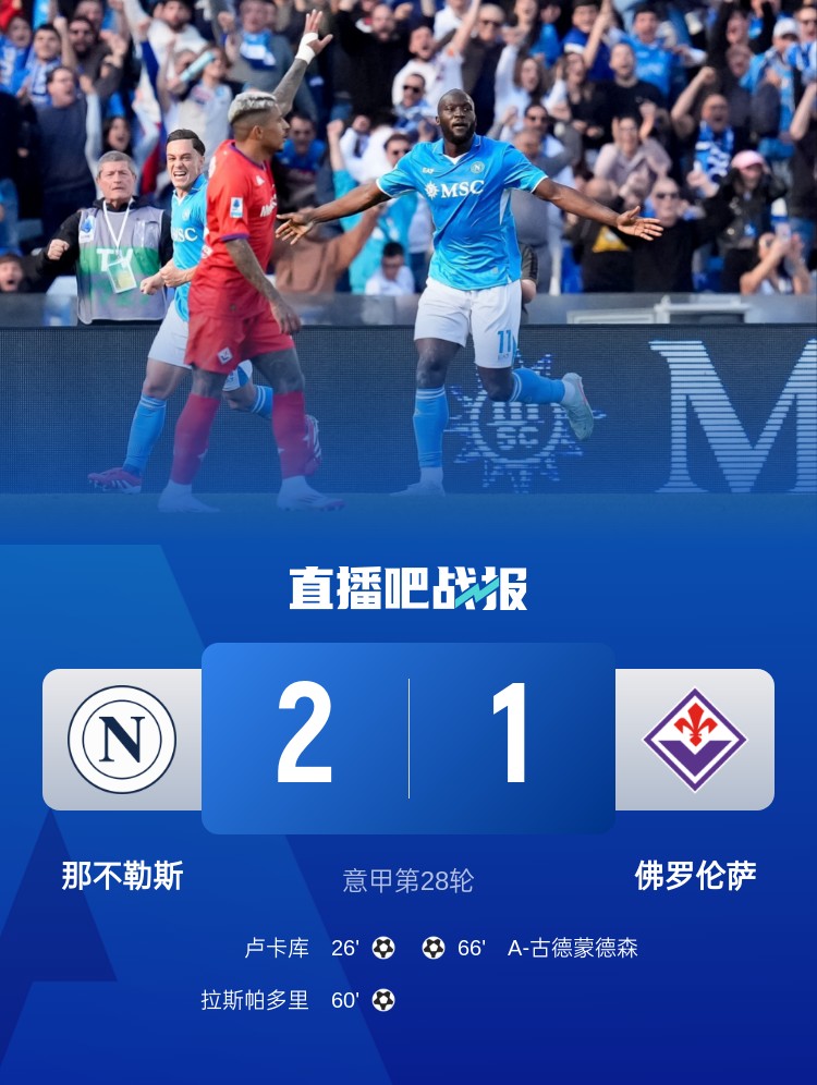 那不勒斯2-1擊敗佛羅倫薩,取得近6輪首勝,盧卡庫、拉斯帕多里破門。