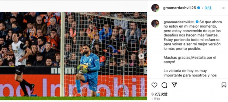 賽后瑪瑪達(dá)什維利更新社媒致歉,他寫道:“我清楚自己目前并不在最佳狀態(tài),但是困難會讓人變得更加堅強,接下來我會盡我所能拿出最佳水平。非常感謝梅斯塔利亞球迷們的支持!這場勝利非常重要,并且讓我們打起干勁繼續(xù)應(yīng)對之后的每一場比賽。繼續(xù)前進!”