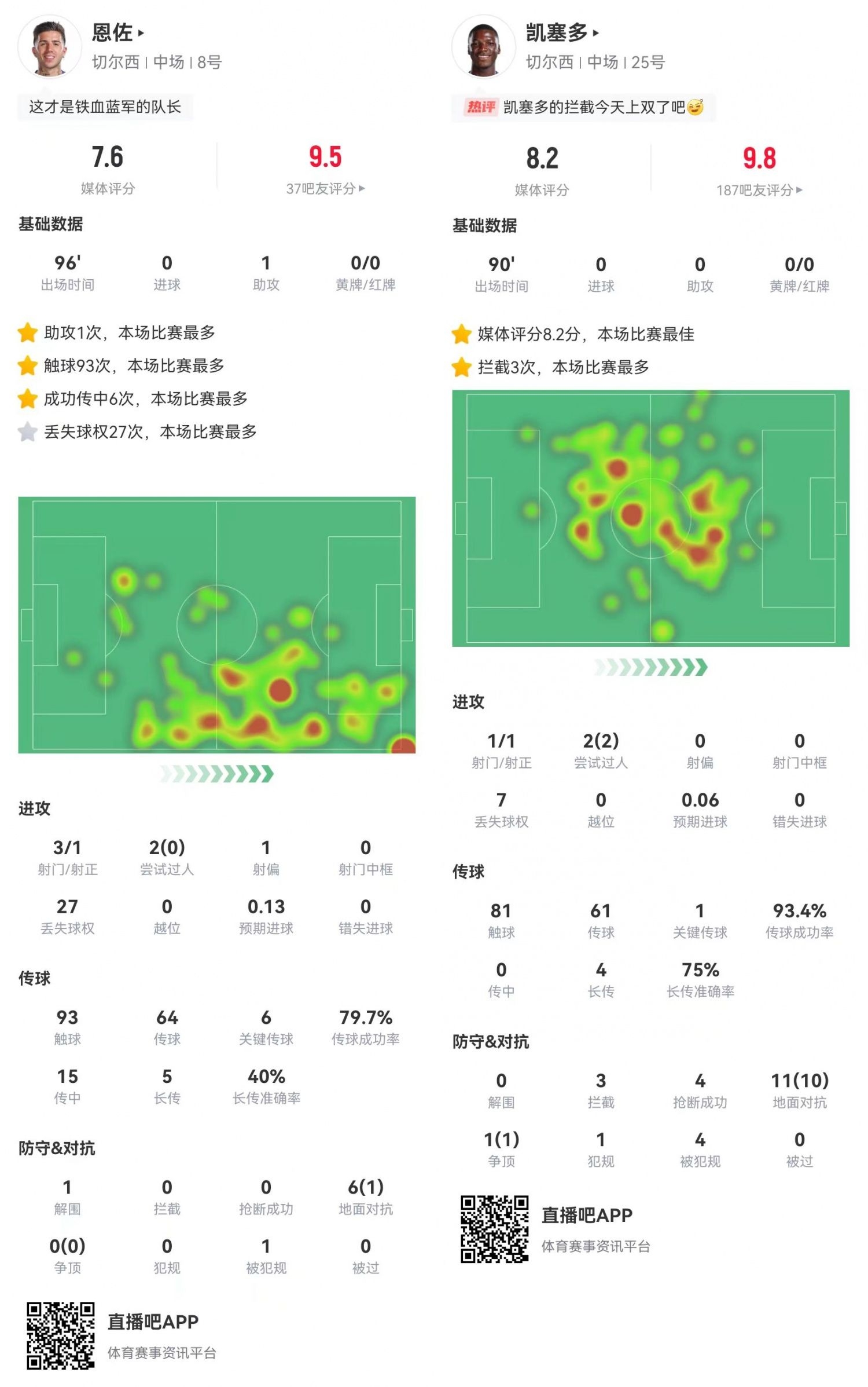 本場(chǎng)比賽恩佐與凱塞多的發(fā)揮可圈可點(diǎn)?!皣L試助攻王”恩佐總算“撿”到一個(gè)助攻,庫庫雷利亞的制勝球便是由恩佐傳導(dǎo)。凱塞多則繼續(xù)自己的戰(zhàn)神級(jí)發(fā)揮,本場(chǎng)比賽貢獻(xiàn)12次對(duì)抗11次成功,還有3攔截4搶斷0被過的鐵閘表現(xiàn)。切爾西的雙腰進(jìn)可攻退可守,正是藍(lán)軍本賽季戰(zhàn)績(jī)不錯(cuò)的原因之一。