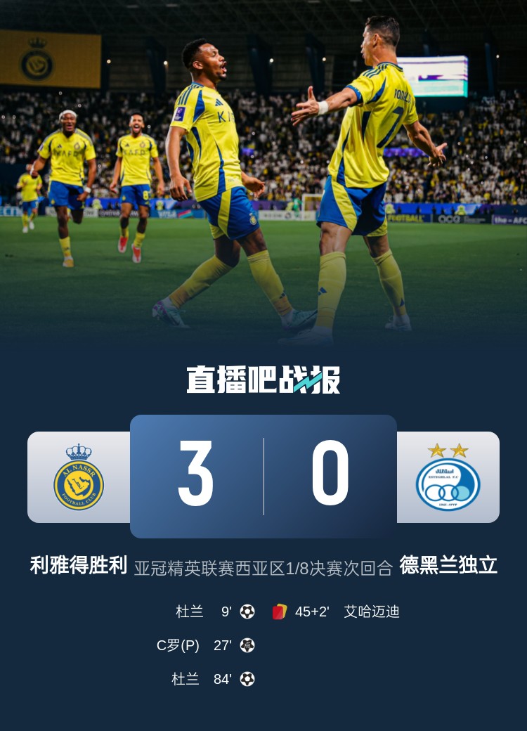 亞冠精英聯(lián)賽西亞區(qū)1/8決賽次回合,C羅進(jìn)球,杜蘭梅開二度,利雅得勝利3-0德黑蘭獨(dú)立,晉級(jí)亞冠八強(qiáng)。