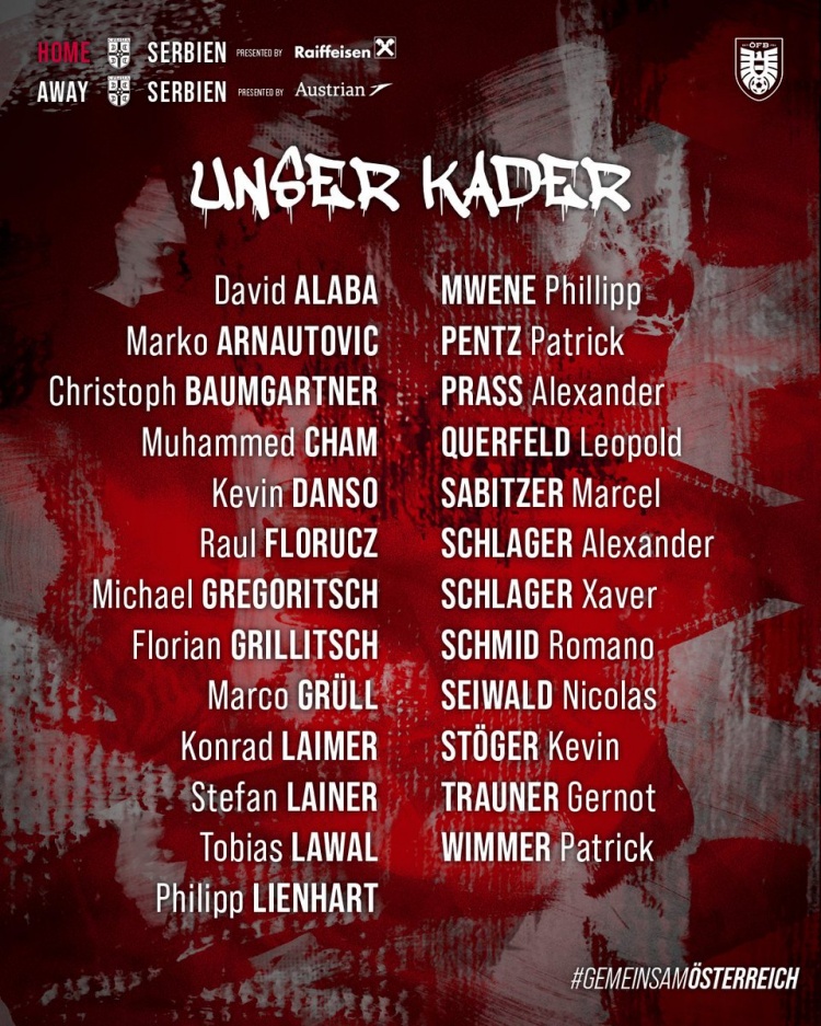 3月11日訊 奧地利公布最新一期國家隊名單,阿拉巴領(lǐng)銜,阿瑙托維奇、薩比策、萊默爾、丹索在列。