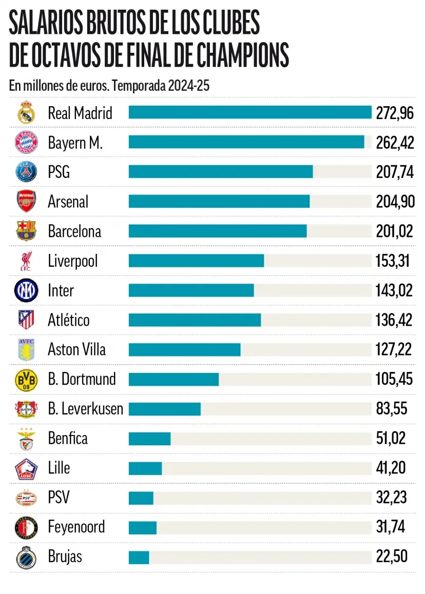 有五家俱樂部的薪資超過2億歐元(皇馬、拜仁、巴黎、阿森納和巴薩),而四家低于5000萬歐元(埃因霍溫、費(fèi)耶諾德、布魯日和里爾)。今天和明天,這些低薪球隊(duì)中會否有黑馬殺入四強(qiáng)呢?