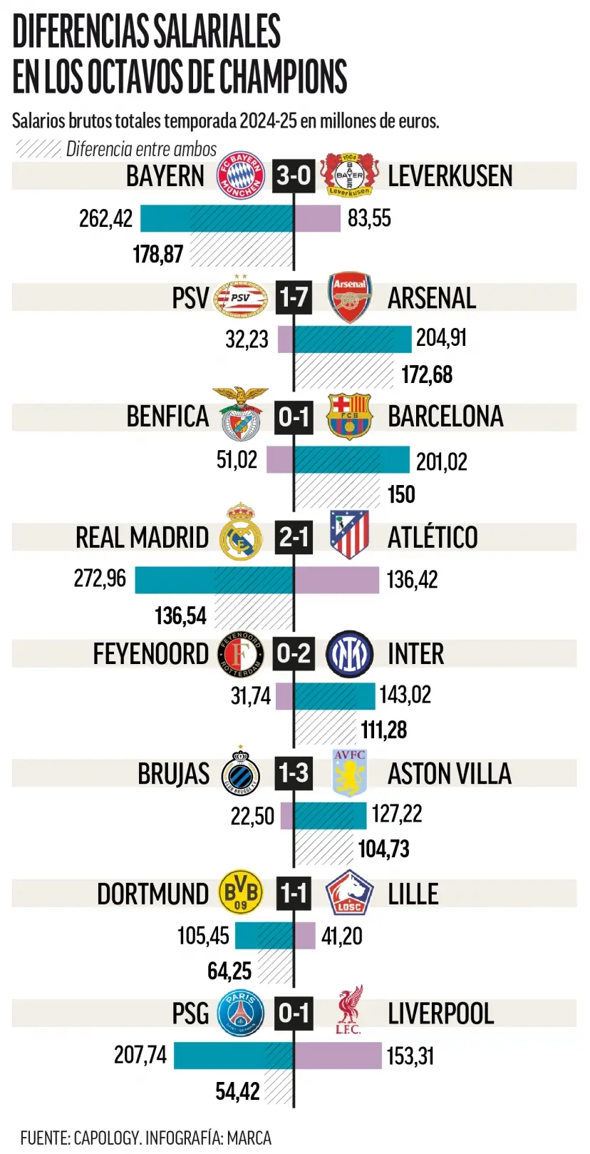 根據(jù)足球財(cái)務(wù)專業(yè)網(wǎng)站Capology的數(shù)據(jù),如果以球員薪資支出為標(biāo)準(zhǔn),最不平衡的淘汰賽是對陣拜仁和勒沃庫森的比賽,拜仁的薪資支出幾乎是對手的三倍(2.624億歐元對8350萬歐元)。第二大差距出現(xiàn)在阿森納與埃因霍溫的對決中,阿森納球員的2.049億歐元薪資遠(yuǎn)超埃因霍溫的3220萬歐元,差距高達(dá)六倍。第三個(gè)薪資差距較大的對決是本菲卡與巴塞羅那,巴薩球員的薪水是葡萄牙球隊(duì)的四倍(2.01億歐元對5100萬歐元)。皇馬與馬競的陣容薪資差距恰好是兩倍,皇馬為2.729億歐元,馬競為1.364億歐元。