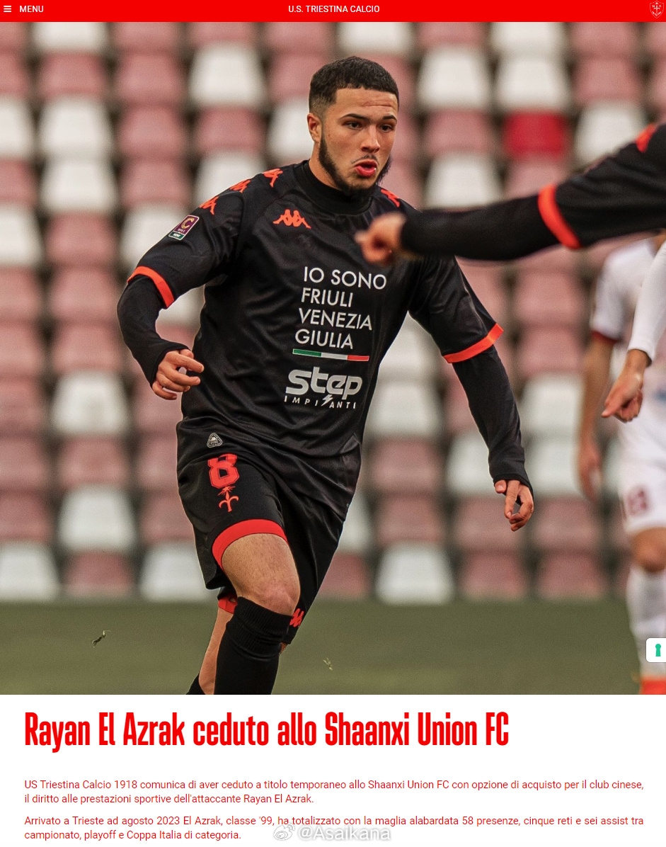意丙聯(lián)賽球隊的里雅斯特人(US Triestina)官方宣布,該隊的荷蘭球員拉揚·埃爾阿茲拉克(Rayan El Azrak)以租借并附買斷條款的方式加盟中甲新軍陜西聯(lián)合。埃爾阿茲拉克今年25歲,司職中場/邊鋒。曾在阿賈克斯、烏特勒支等隊接受青訓(xùn),后效力于芬洛、馬斯特里赫特等隊,2023年夏天加入的里雅斯特人,為該隊出場58次,打進5球。