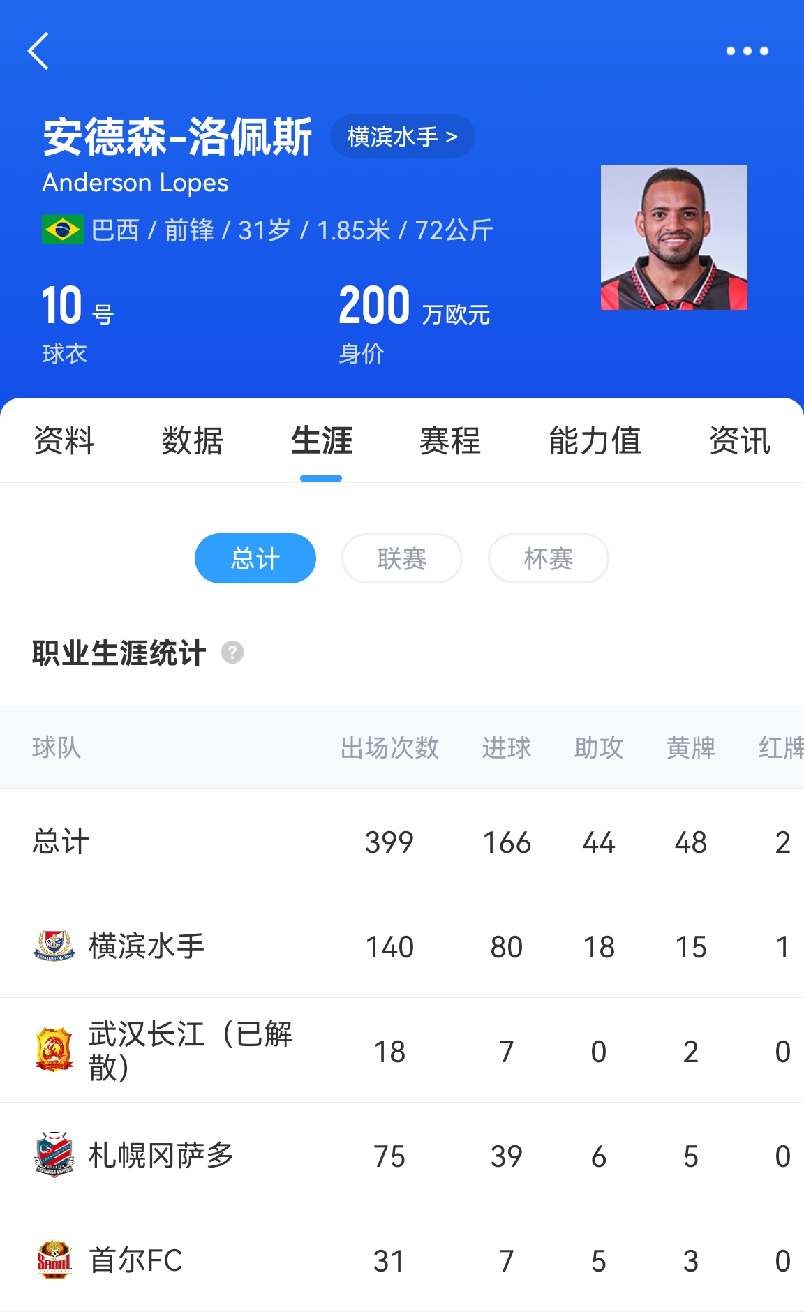 安德森-洛佩斯曾短暫效力中超聯(lián)賽,2021賽季,洛佩斯代表武漢隊出場18次打入7球。2022年2月,武漢隊官宣洛佩斯加盟橫濱水手,轉(zhuǎn)會費(fèi)180萬美元。就在這次官宣不到一年后,武漢隊宣布解散。